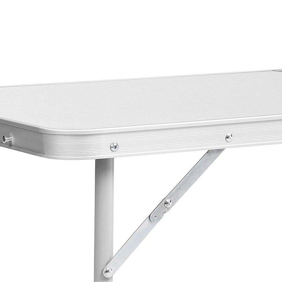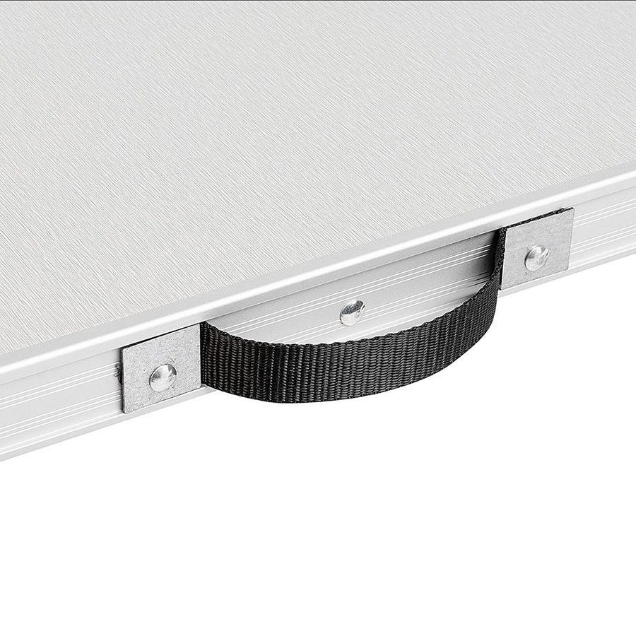 Каркас стола выполнен из неанодированного профиля с алюминиевыми ножками из трубы. Столешница изготовлена из ХДФ, покрыта влагозащитным покрытием. Ручка для переноски выполнена из ранцевой ленты.