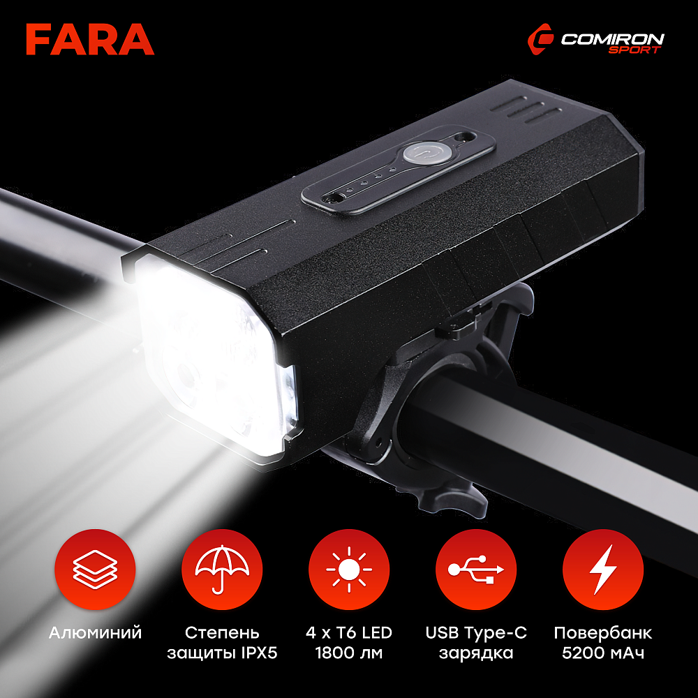 Благодаря 4 LED (4*T6 LED) диодам способен не просто предупреждать встречные объекты, но и великолепно освещать ваш путь как в сумерки, так и в ночное время. Не даром фонарь получил название FARA!