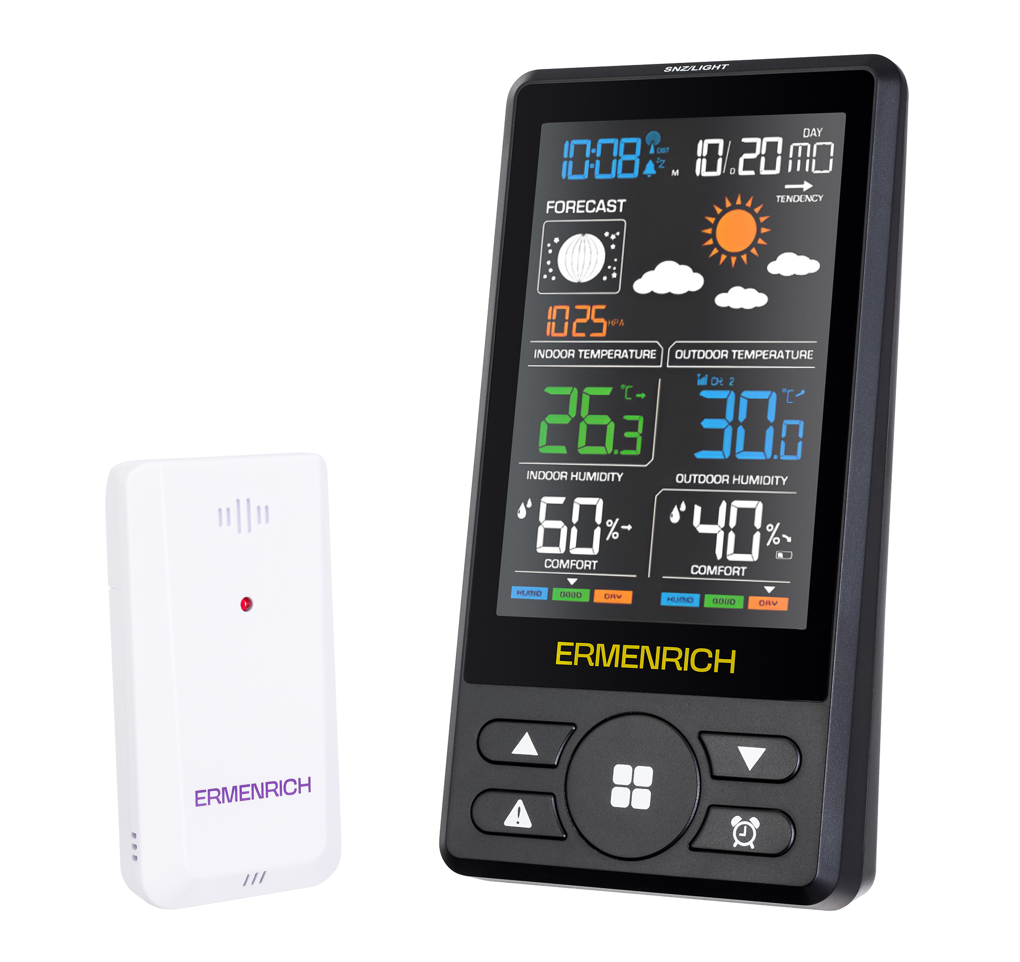 Ermenrich Report WR50 отличается от аналогичных моделей широкими рабочими диапазонами. Так, атмосферное давление она измеряет в промежутке от 850 до 1050 гПа, влажность – от 10 до 99%, температуру дома – от 0 до +50 °C, а за окном – от –40 до +70 °C. Погрешность для каждого из параметров остается минимальной. Помимо измерения атмосферных показателей в режиме реального времени устройство умеет собирать и записывать информацию для дальнейшего любительского анализа – например, оно фиксирует минимальные и максимальные значения температуры и влажности, оповещает о повышении низких/высоких порогов, сигнализирует о достижении определенного уровня тепла или холода.
