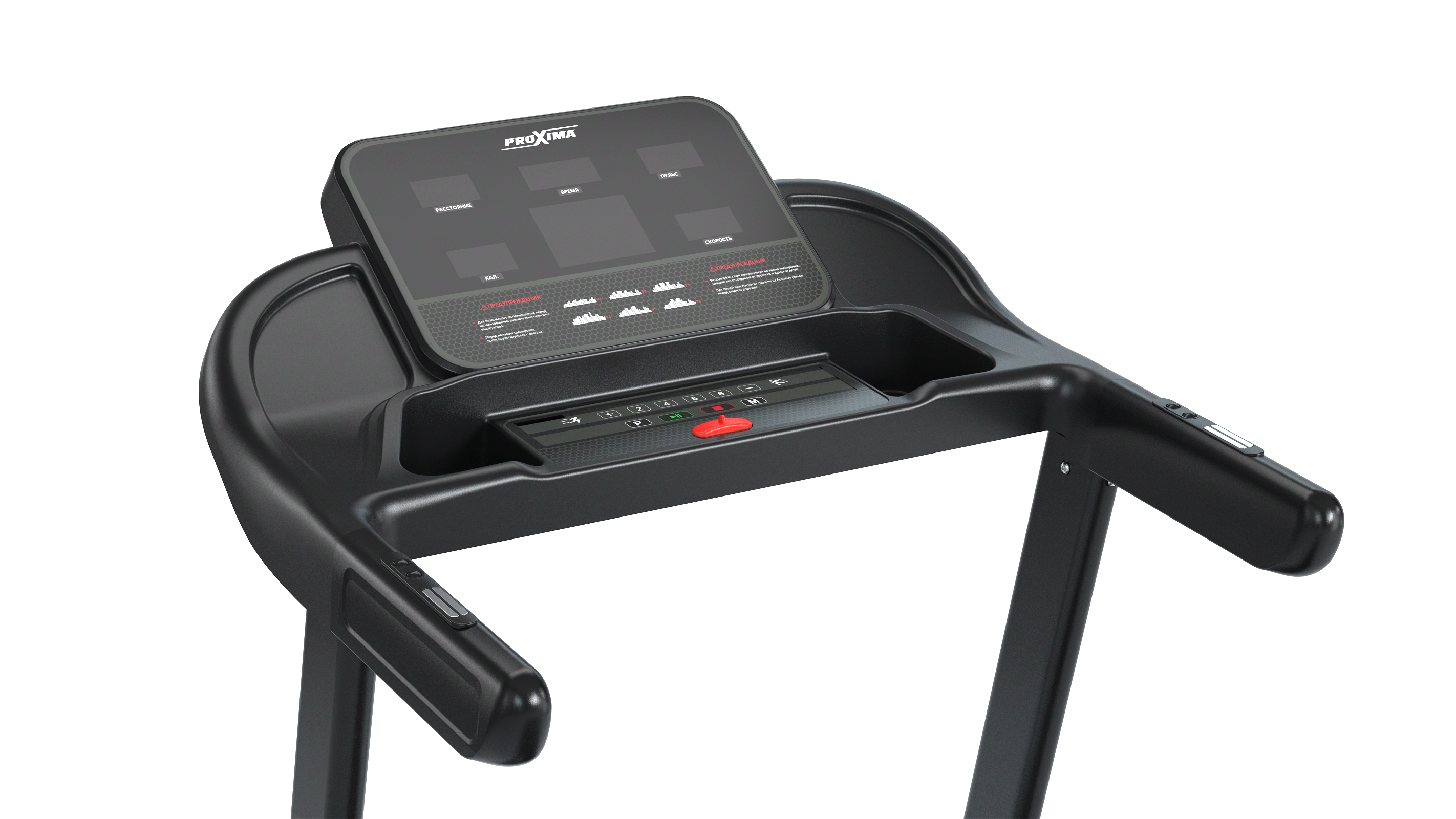 Сенсорные датчики на поручнях измеряют сердечный ритм. Кнопки регулировки скорости на рукоятках позволят менять ее без отрыва от тренировки.