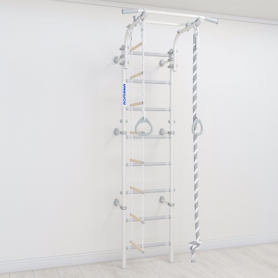 В этом ДСК есть регулируемый турник, который можно переместить на любую высоту, позволяет комфортно заниматься детям разных возрастов. Он фиксируется надежными и удобными хомутами нового образца, которые быстро и легко собираются. Благодаря подвижным хомутам на пристенных кронштейнах, комплекс можно закрепить в нужном положении, включая угловое. Это позволяет избежать попадания в проводку или полости в стене.