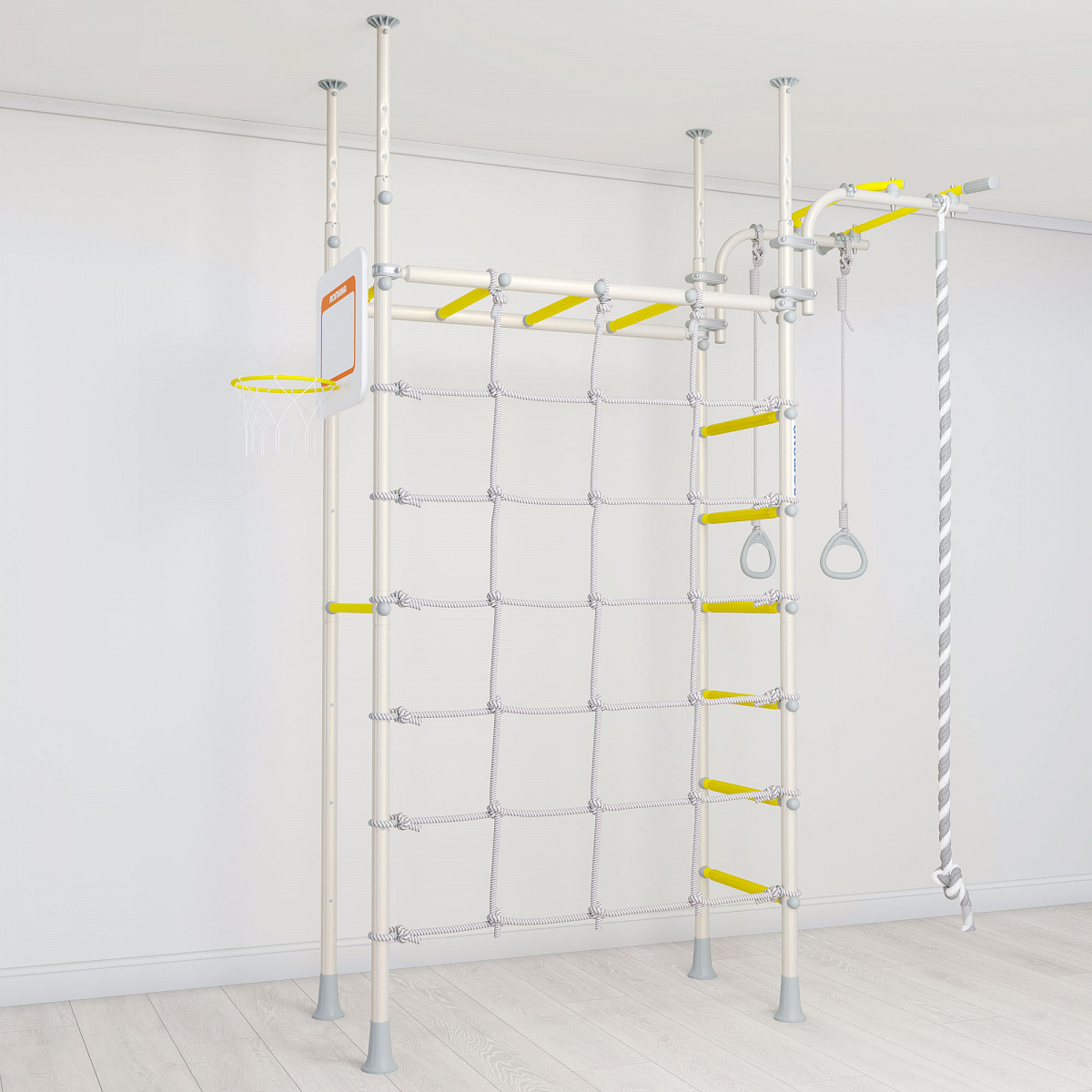 В комплексе ROMANA Р4 предусмотрено расширенное дополнительное оборудование: канат, кольца гимнастические, баскетбольный щит. Канатный лаз выполнен из шнура повышенной прочности и устанавливается между двумя широкими стойками. Вы можете добавить к этому комплексу ROMANA Доп20 качели для самых маленьких, и закрепить их на рукоходе, предварительно сняв канатный лаз и опустив рукоход на рекомендуемую высоту 1,2 м. С помощью детского спортивного комплекса ROMANA Р4 юные атлеты развивают координацию, ловкость и силу!