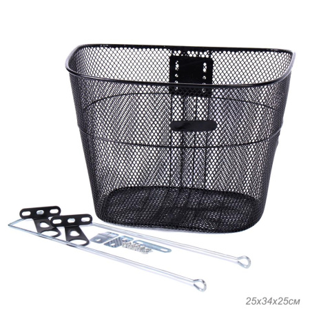 Корзина для велосипеда металлическая, с креплением на переднее колесо под резьбовую вилку. 2 кронштейна на рулевую колонку. Черная. / QY-CL-004