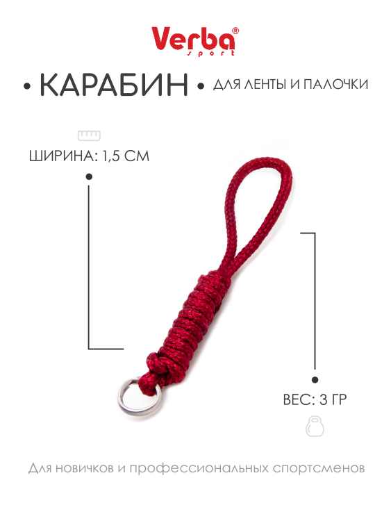 Веревочный карабин для художественной гимнастики не повреждает ленту, не запутывается и способен выдерживать большие нагрузки. Карабин гимнастический имеет надежное металлическое кольцо для крепления к палочке.