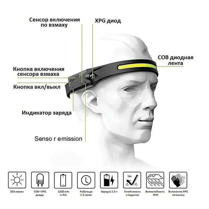 Фонарь налобный LED Огонь НТ-116/Р-G28/5808A/BL-G28, аккумуляторный