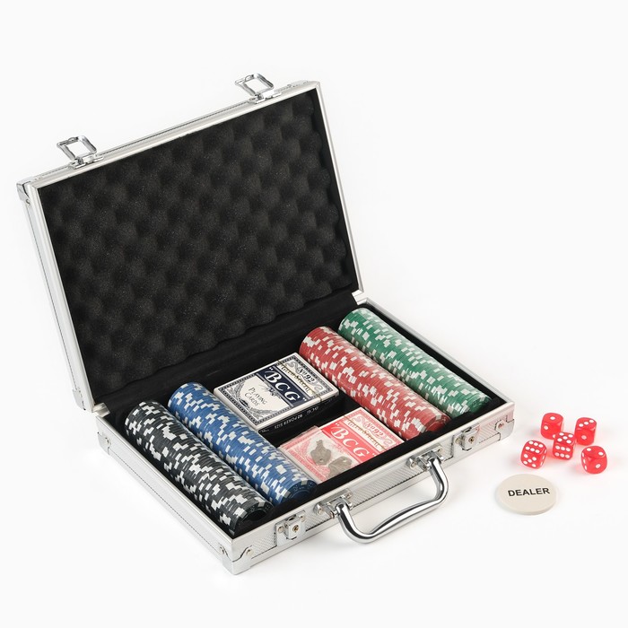 Покер, набор в металлическом кейсе (2 колоды карт, фишки 200 шт. без номинала, 5 кубиков)