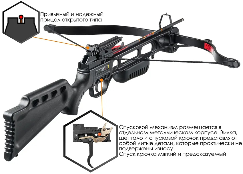 - При использовании специальных затупленных наконечников-гуманизаторов арбалет можно использовать для самообороны.
