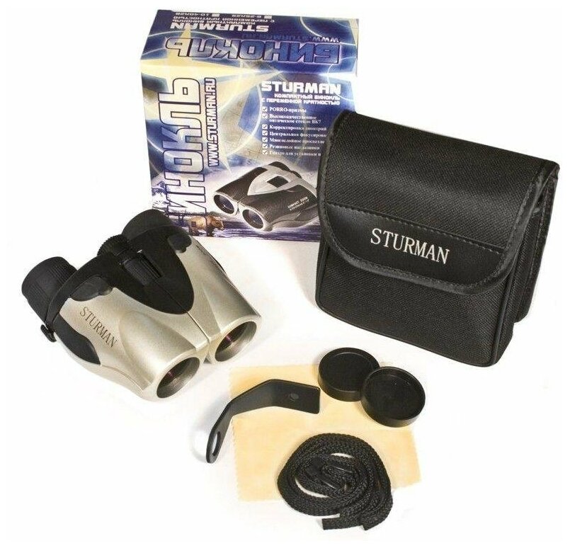 - Лёгкий и стильный корпус бинокля Sturman 8-25x25 изготовлен из ударопрочного пластика, окрашен в серебристый цвет. Большие и удобные наглазники из резины надёжно фиксируют положение глаз относительно линз окуляра, отсекая паразитную засветку и облегчая позиционирование бинокля.