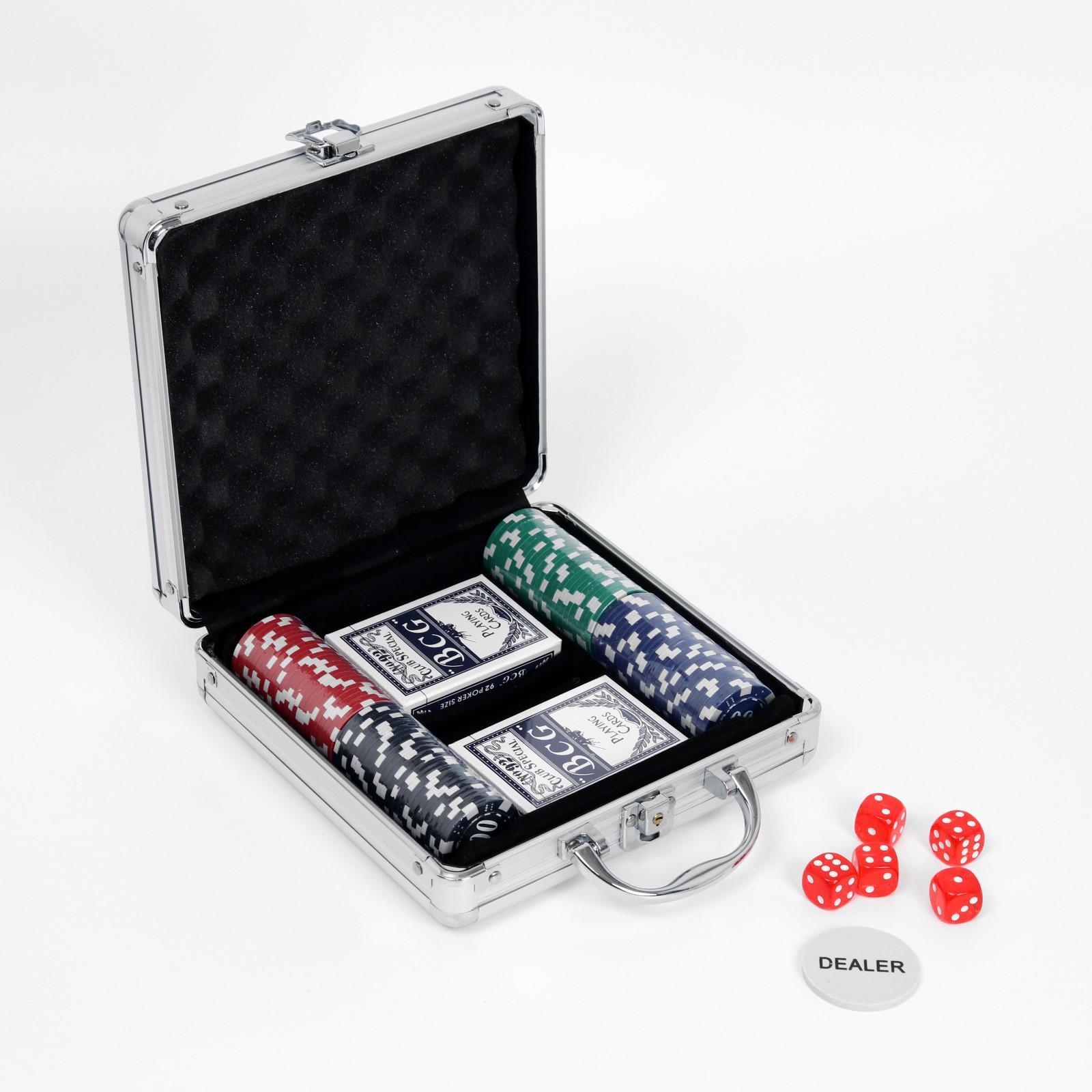 Набор для игры в покер в металлическом кейсе (2 колоды, фишки 100 шт с номиналом, 5 кубиков), 20 х 20 см, артикул 269187