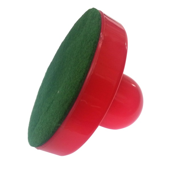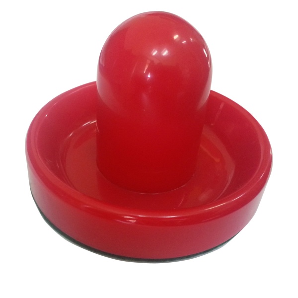 Бита для аэрохоккея выполнена из красного пластика с зеленой подклейкой.