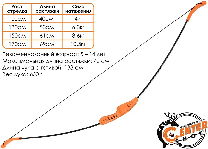 Лук подходит детям, подросткам и взрослым, благодаря большому диапазону растяжки и небольшой силе натяжения. Стрелковое окно располагается по центру рукоятки, что нивелирует любые ошибки стрелка и не дает стреле выпасть из лука при прицеливании.