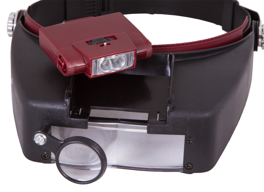 Налобную лупу можно зафиксировать на голове при помощи специального ремня с регулировкой длины. Для освещения рабочей области используется светодиодная подсветка. Вы можете включать и выключать ее при помощи рычажка на корпусе.
