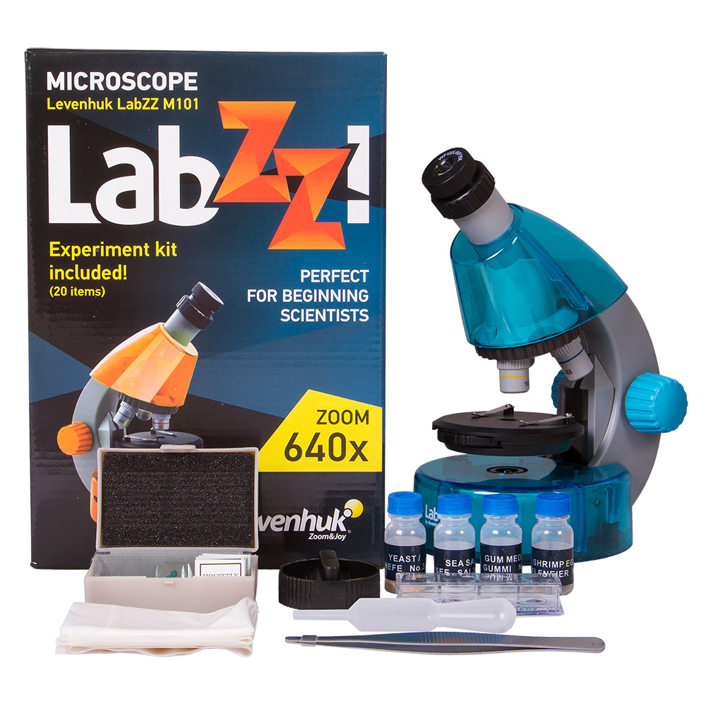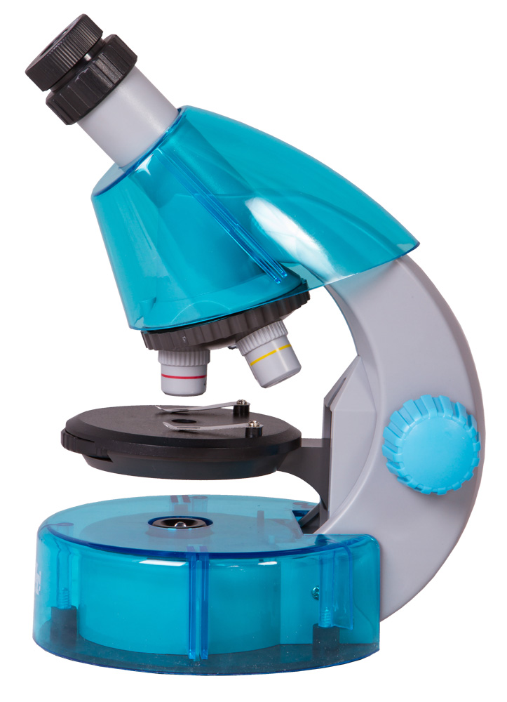 Levenhuk LabZZ M101 Azure\Лазурь – это детский микроскоп с качественной оптикой, как у серьезных «взрослых» моделей. Микроскоп снабжен тремя объективами: 4x, 10x и 40x. Для смены объектива нужно просто повернуть револьверное устройство. В комплект входит выдвижной окуляр с двумя увеличениями (10 и 16 крат) – это гораздо удобнее, чем два обычных окуляра. Ребенку не придется менять окуляры, и он не потеряет их. Микроскоп имеет шесть степеней увеличения – 40, 64, 100, 160, 400 и 640 крат.