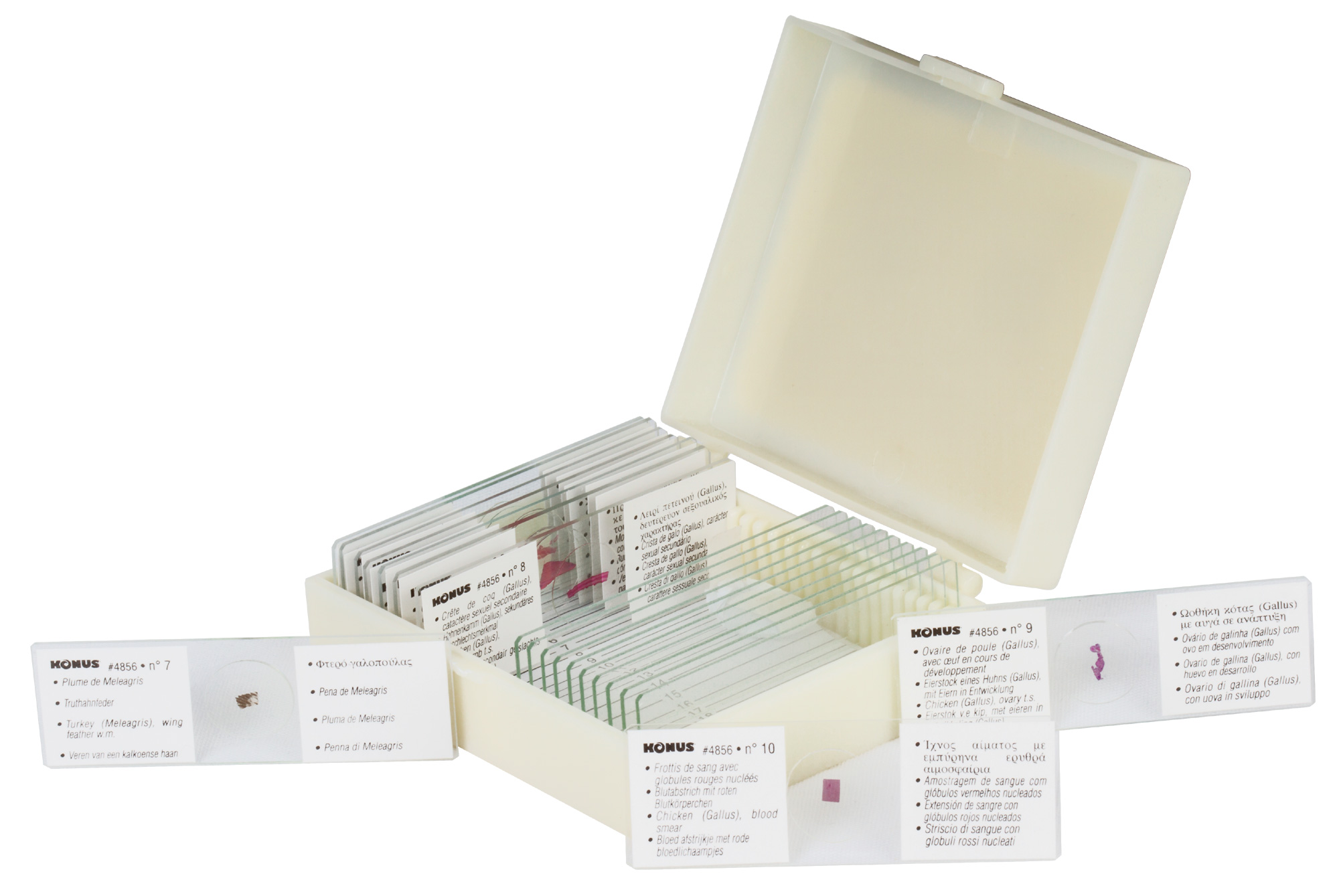 В этом наборе микропрепаратов Konus вы найдете образцы тканей ящериц, змей и птиц. Их можно поместить на предметный столик и подробно изучить под микроскопом – все образцы уже подготовлены к наблюдениям. С помощью готовых микропрепаратов Konus можно узнать много нового об окружающем мире и расширить свои познания в зоологии.