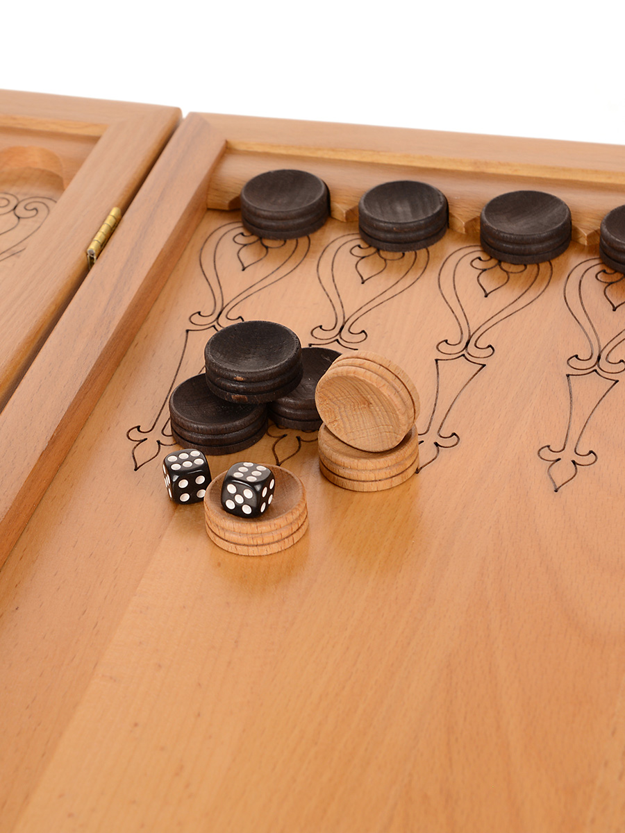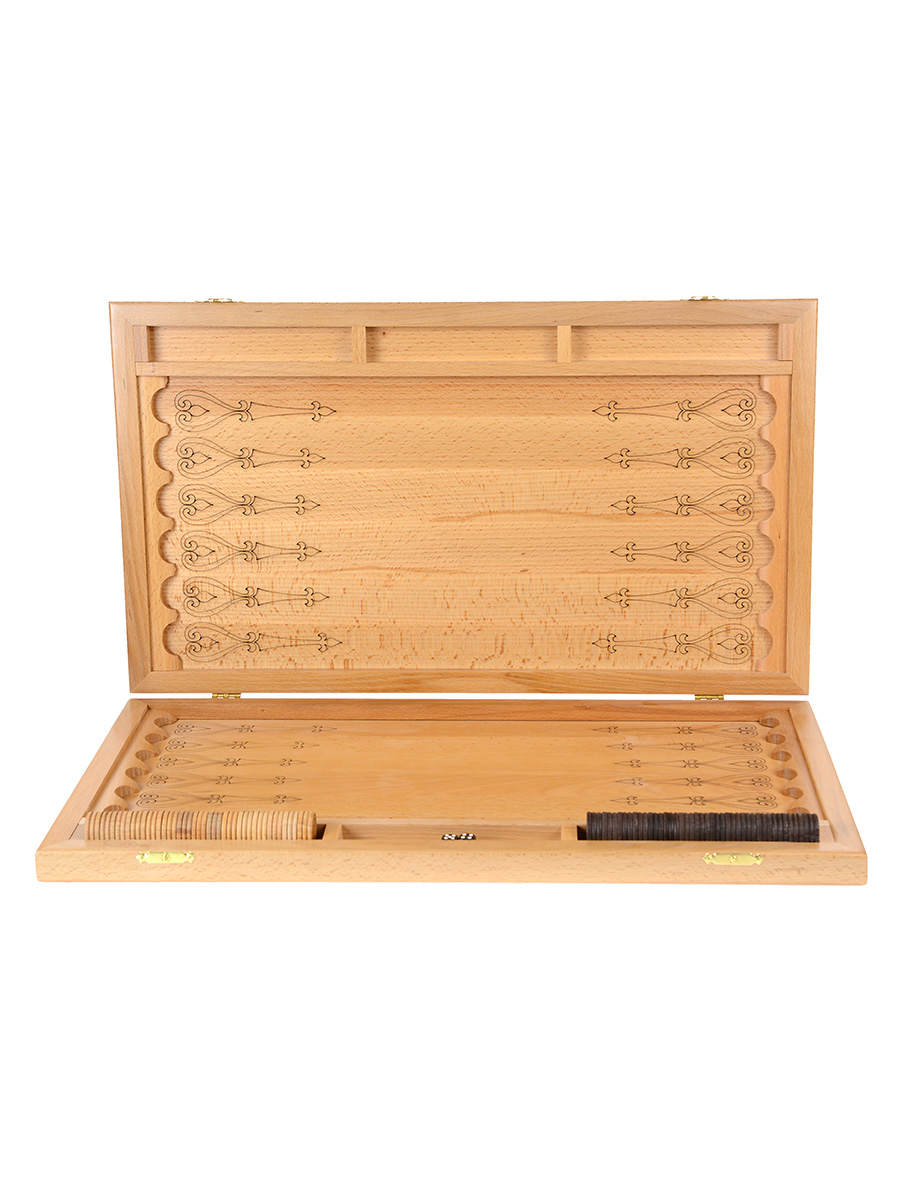 - Доска соответствует всем требованиям профессионалов и любителей игры в нарды: деревянные фишки диаметром 29 мм имеют комфортные для захвата углубления по центру, удобные ячейки (лузы), ложемент для хранения фишек и костей по краю игрового полотна.