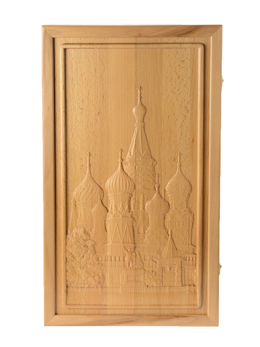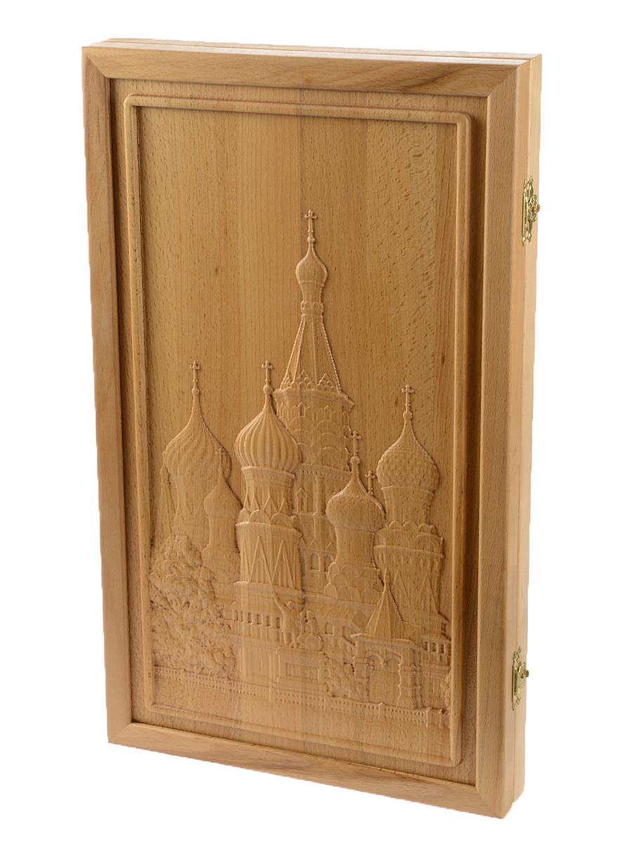 - Лицевая сторона украшена тонкой резьбой с изображением собора, а внутренняя и обратная стороны нард отделаны натуральным шпоном (из экзотических пород африканских деревьев) в технике маркетри.