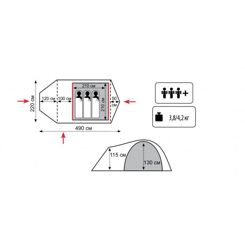 - Двухслойная палатка с тремя входами и двумя тамбурами