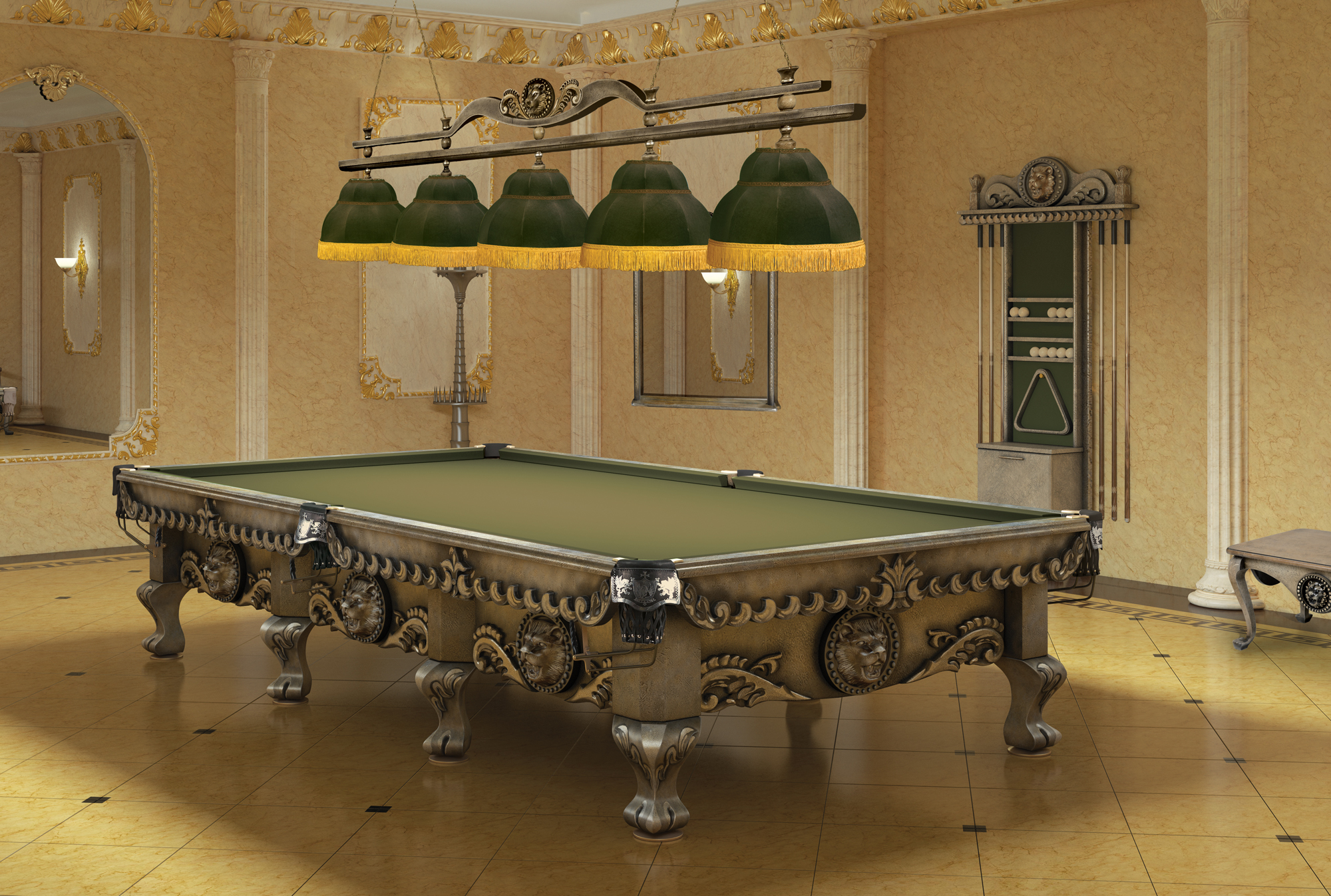 Размер игрового поля 12-ти футового стола: 3,50х1,75 м. Бильярдная комната должна быть не меньше 7,00х5,25 м.