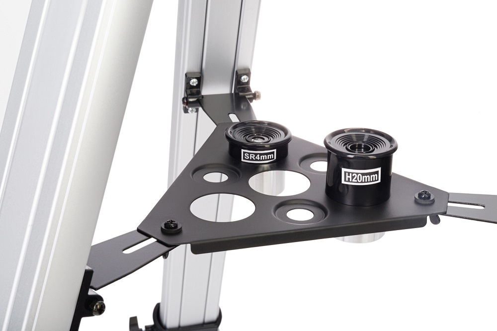 Вилочная азимутальная монтировка снабжена микровинтом, т. е. наводку на объект можно проводить очень точно. Алюминиевая тренога снабжена полочкой для аксессуаров, высоту треноги можно регулировать.