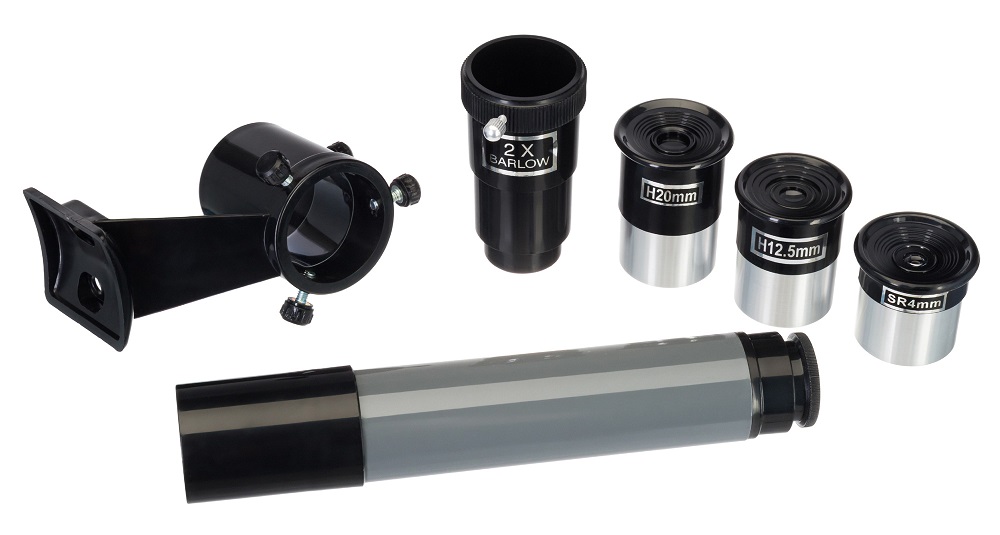 Так как в телескопе установлена стеклянная оптика с антибликовым покрытием, передаваемая картинка ясная, четкая и свободная от искажений. В комплектацию уже включены базовые аксессуары, необходимые для наблюдений: линза Барлоу и три окуляра. При необходимости телескоп можно дооснастить другими принадлежностями – фокусер поддерживает любые аксессуары с посадочным диаметром 1,25 дюйма.