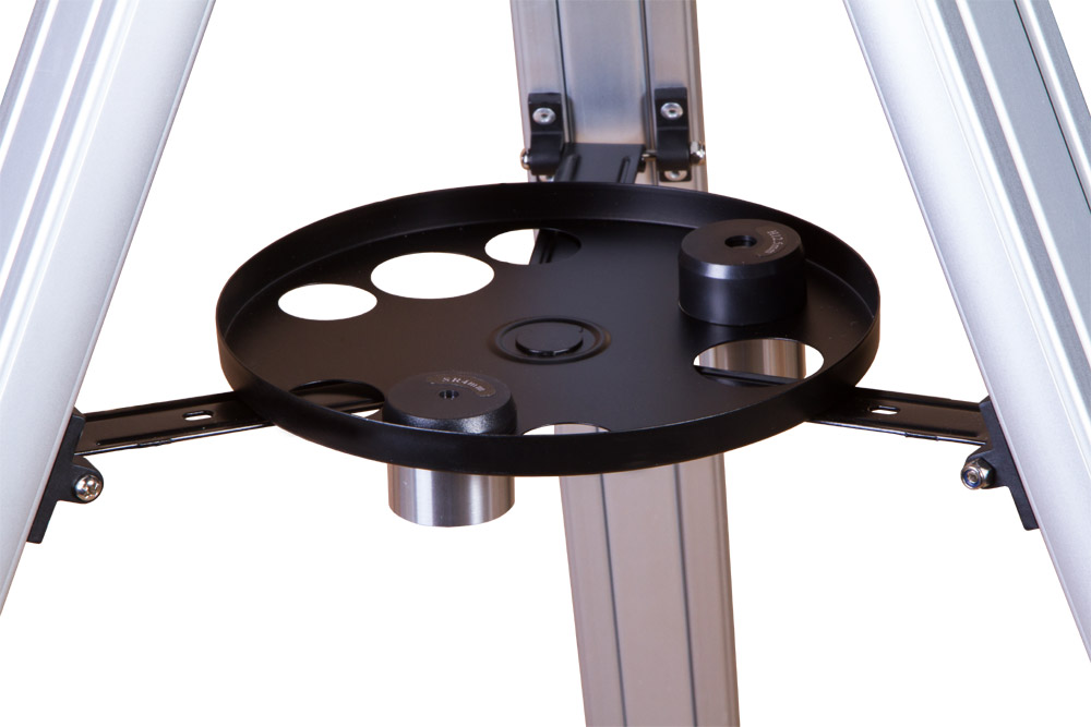 Телескоп устанавливается на прочную алюминиевую треногу регулируемой высоты. Она надежно стоит даже на неровных поверхностях, не качается при сильном ветре, спокойно выдерживает вес телескопа с монтировкой и противовесом. На треногу устанавливается лоток для аксессуаров (в комплекте).