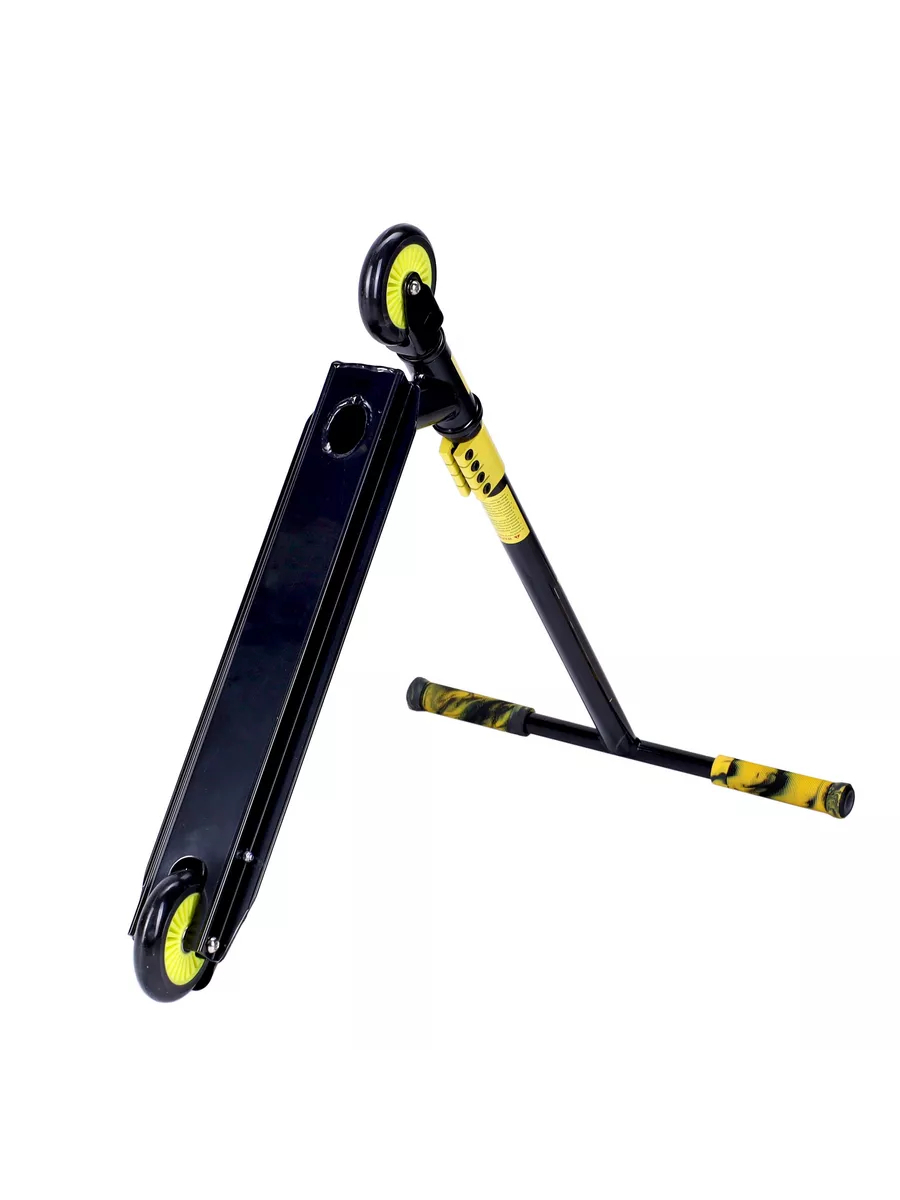 Такой самокат рассчитан на большие нагрузки, возникающие при исполнении трюков и не имеют складного механизма.
