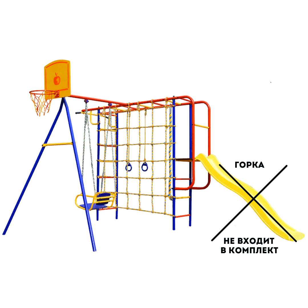 Горка,лестница веревочная, трапеция, щит баскетбольный, сетка для лазания в комплект не входят и приобретаются отдельно.
