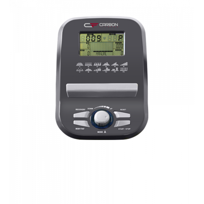 - Показания консоли профиль, время, дистанция, скорость, калории, обороты в мин., пульс, Ватты, фитнес-тест (Recovery), фитнес-оценка, жироанализатор (Body Fat), индекс массы тела (BMI), температура